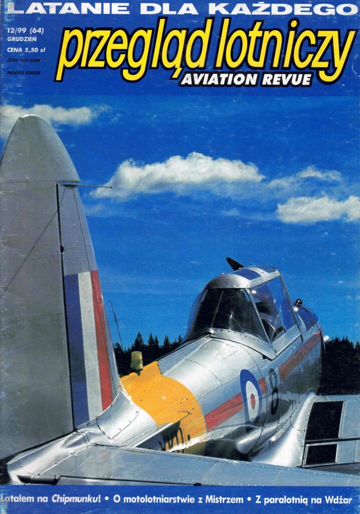 Przegląd Lotniczy – grudzień 1999 Zespół Redakcyjny 01.12.1999 1999 Możliwość komentowania Przegląd Lotniczy – grudzień 1999 została wyłączona 555 Odsłon Spis numeru: Latałem na Chipmunku[Latanie samolotowe / strona: 4 / autor: Maciej Noskowski]Autor opisuje swoje latanie na samolocie DHC-1 Chipmunk No to chlup! (na pływakach legalnie)[Latanie samolotowe / strona: 6 / autor: Jacek Mainka]Autor opisuje latanie na wodnosamolotach Wspomnienia pilota doświadczalnego[Historia / strona: 13 / autor: Janusz Żurakowski]Pilot doświadczalny Janusz Żurakowski opowiada o swojej pracy, cz. 2 Dinah Might – Liberator z Jeleśni[Wrakowisko / strona: 16 / autor: Andrzej Olejko]O zestrzelonym 13.09.1944 roku nad Oświęcimiem Liberatorze W krainie termicznych diabłów[Lotniarstwo / strona: 18 / autor: Dariusz Czernicki]O lataniniu na lotni w Nowej Zelandii Magni’s day 1999[Wiatrakowce / strona: 21 / autor: Krzystof Krawcewicz]Notatka o zlocie wiatrakowców, Speziana, Włochy, 17.09.1999 r. Oczywiście Jungmann[Konstrukcje / strona: 22 / autor: Krzystof Krawcewicz]Krótki opis historii samolotów Jungmann i Jungmeister Historia 70-lecia Aeroklubu Gdańskiego[Historia / strona: 23 / autor: Marek Kochanowski]Historia 70-lecia Aeroklubu Gdańskiego Tym razem sprzęt nie zawiódł[Motolotniarstwo / strona: 24 / autor: Joanna Królikowska]Rozmowa z Alojzym Dernbachem, motolotniowym Wicemistrzem Świata ’99 Nie zrealizowane konstrukcje SZD[Konstrukcje / strona: 26 / autor: Jerzy Kubalańca]Opis konstrukcji szybowców, które nie weszły do pordukcji seryjnej, cz. 7 Diamentowe zawody[Szybownictwo / strona: 27 / autor: Maciej Całka]Notatka na temat Krajowych Zawodów Szybowcowych o Puchar Prezydenta Ostrowa Wlkp. 18-30.07.1999 r. Przygodne lądowanie[Pilotaż / strona: 28 / autor: Andrzej Pazio]Technika lądowania w terenie przygodnym, cz. 6 Przygodne lądowanie[Szybownictwo / strona: 28 / autor: Andrzej Pazio]Technika lądowania w terenie przygodnym, cz. 6 Wdżar (mylnie zwany Snozką)[Paralotniarstwo / strona: 34 / autor: Tomasz Kumor]Opis góry Wdżar jako miejsca do latania na paralotniach Przeżyłem własną śmierć[Paralotniarstwo / strona: 36 / autor: Davor Jardas, tłum Bogusław Zając]Autor opisuje swó lot na paralotni w którym wessało go w chmurę Rajd wzdłuż wybrzeża[Paralotniarstwo / strona: 38 / autor: Cezary Jastrzębski]Relacja z Ekspedycji Albatros ’99